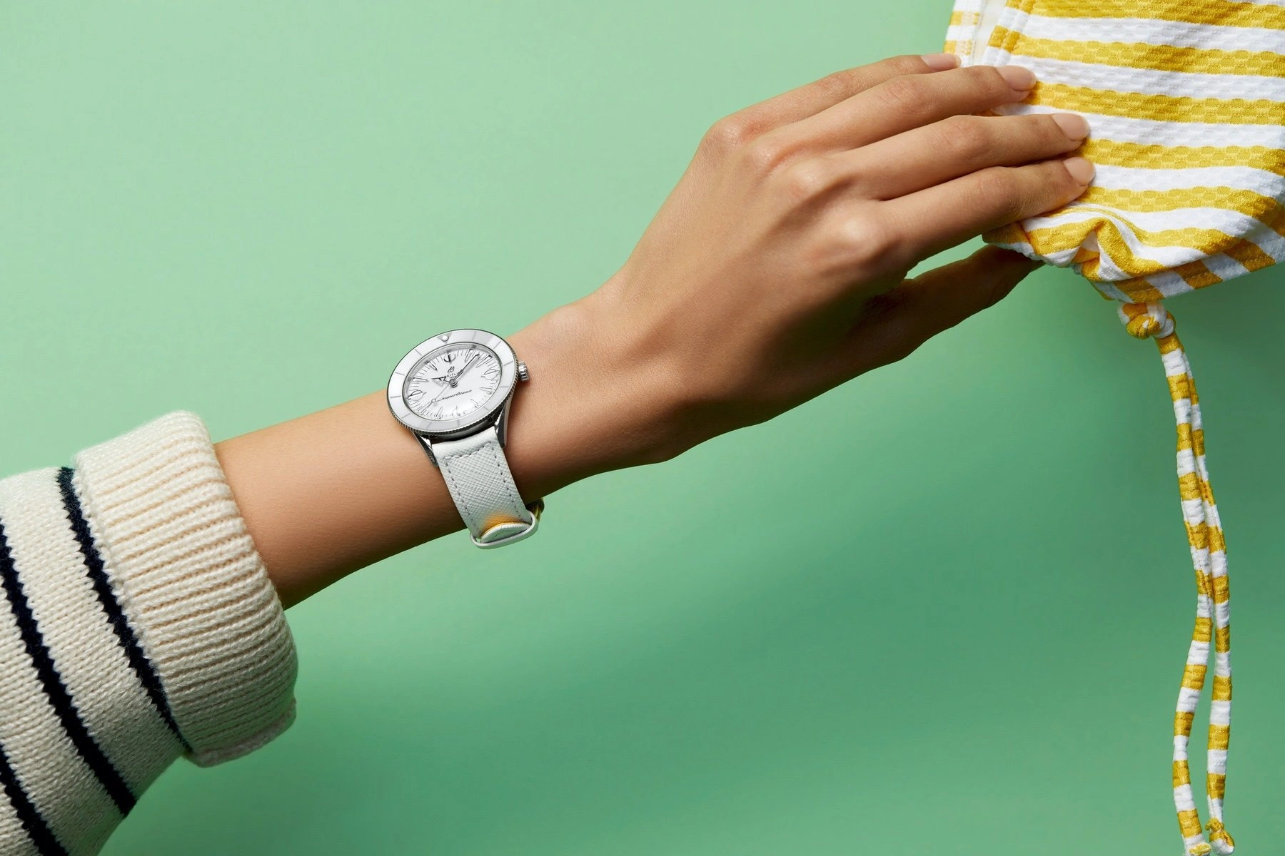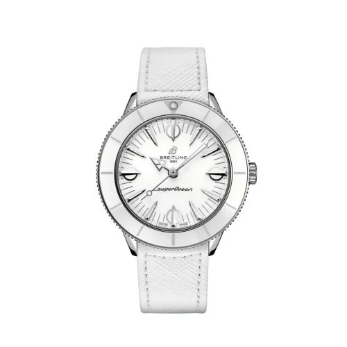 The Breitling Superocean Heritage '57 reference A10340A71A1X1 was introduced in 2021 as part of the 'Pastel Paradise' capsule collection. This Superocean Heritage '57 features a [CASE_DIAMETER] case and a white dial, bezel and strap.