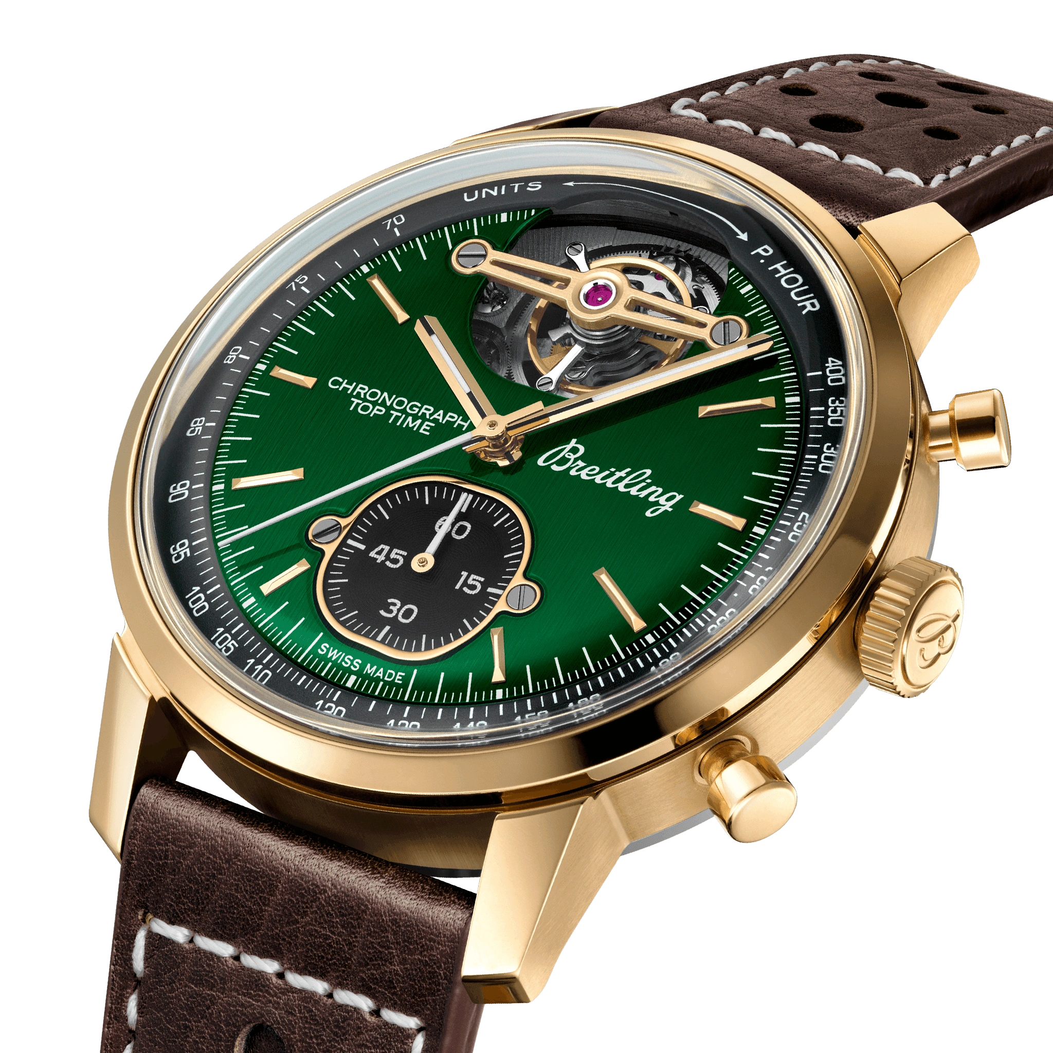 Introduced in 2023, the Breitling Premier Top Time reference NB21251A1L1X1 is part of a 'Capsule' collection of watches paying homage to the world of classic cars. This watch has a bronze & titanium case and a green dial; inside ticks the Caliber B21, a self-winding movement with tourbillon and chronograph.