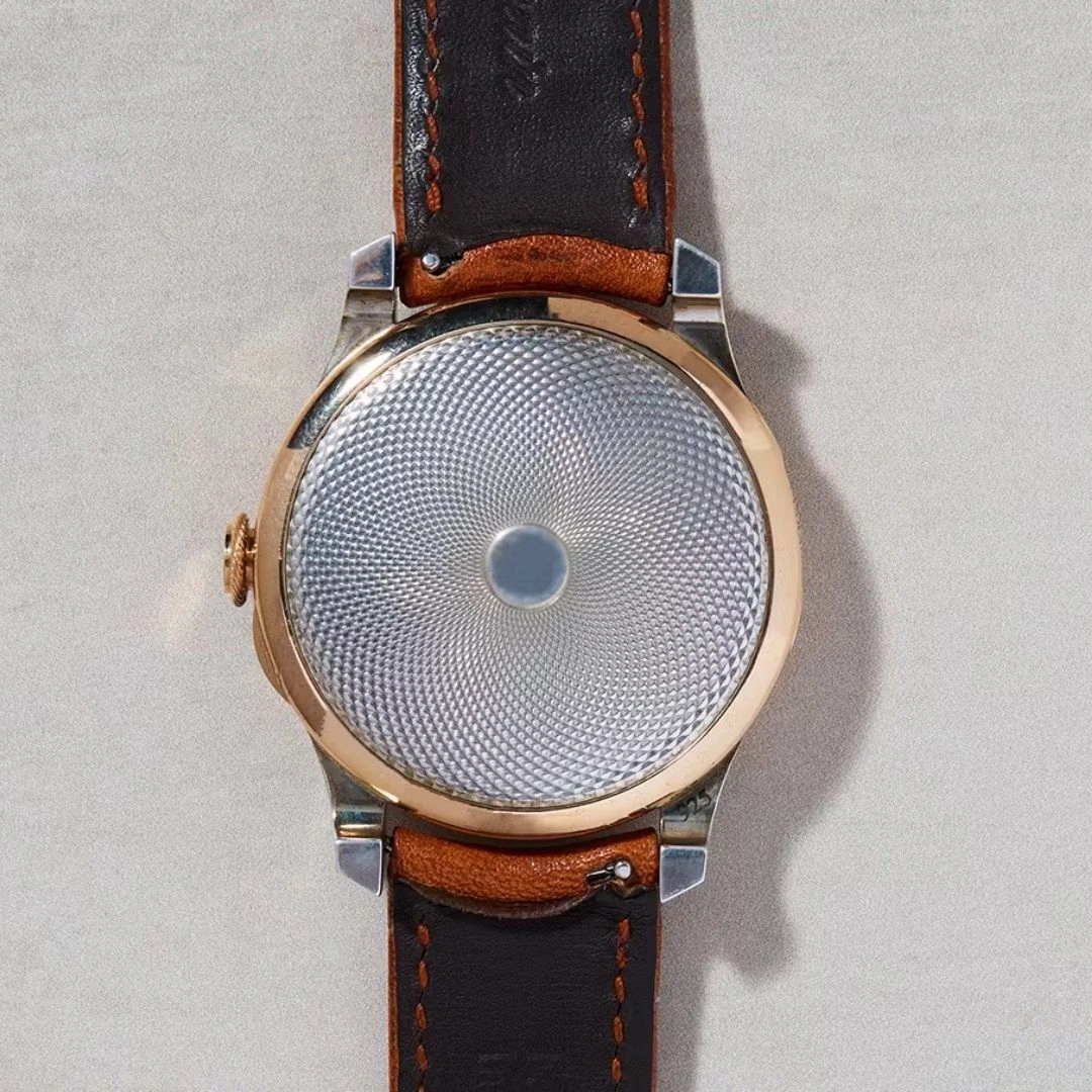 Guilloché Silver and rose Gold case, 40 mm diameter, grained Silver dial with numbers and hour circle engraved and filled.