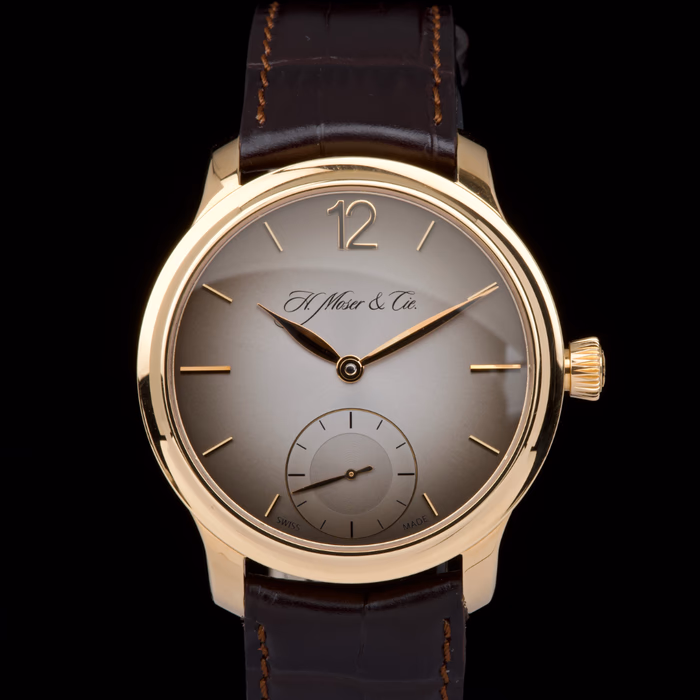 Endeavour Mayu Ref. 321.503-022. Case size 39 mm in rose gold. The watch features the elegant dark grey fumé dial with minimalistic indices, paired with a brown alligator strap secured by the original rose gold pin buckle. Powered by the hand-wound caliber HMC 321 with subsidiary seconds at 6 o’clock, visible through the sapphire caseback, showcasing Moser’s signature finishing.