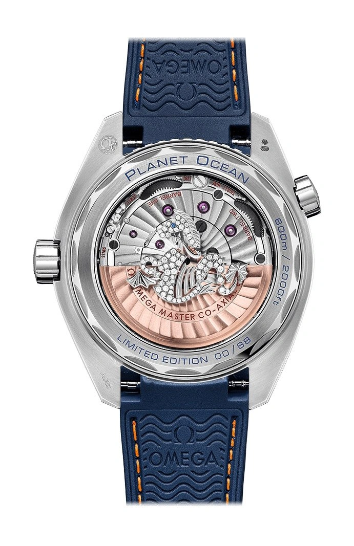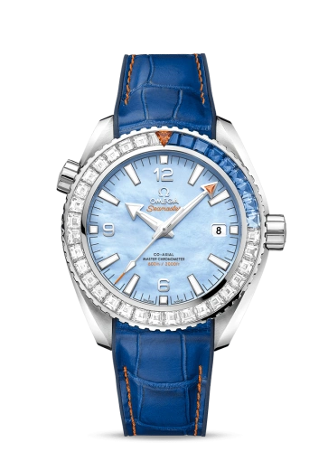 The Omega Seamaster Planet ocean 215.58.44.21.07.001 has a white gold case set with a diamond and sapphire set bezel. The dial is made of baby blue mother-of-pearl; the minute hand and 12 o'clock marker on the bezel are set with an orange sapphire. The case back features a diamond-set seahorse.