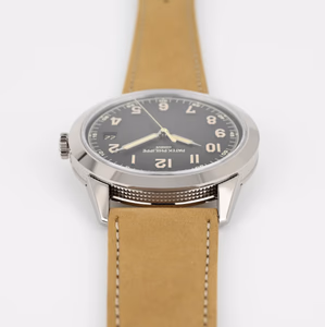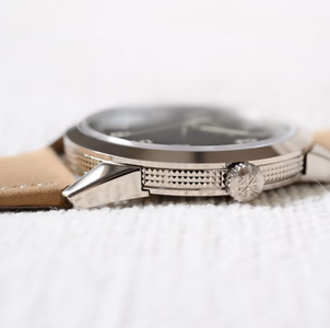 The watch comes with two interchangeable straps—one in beige nubuck calfskin and one in black embossed leather with a fabric pattern—which fit a wrist up to 20 cm.