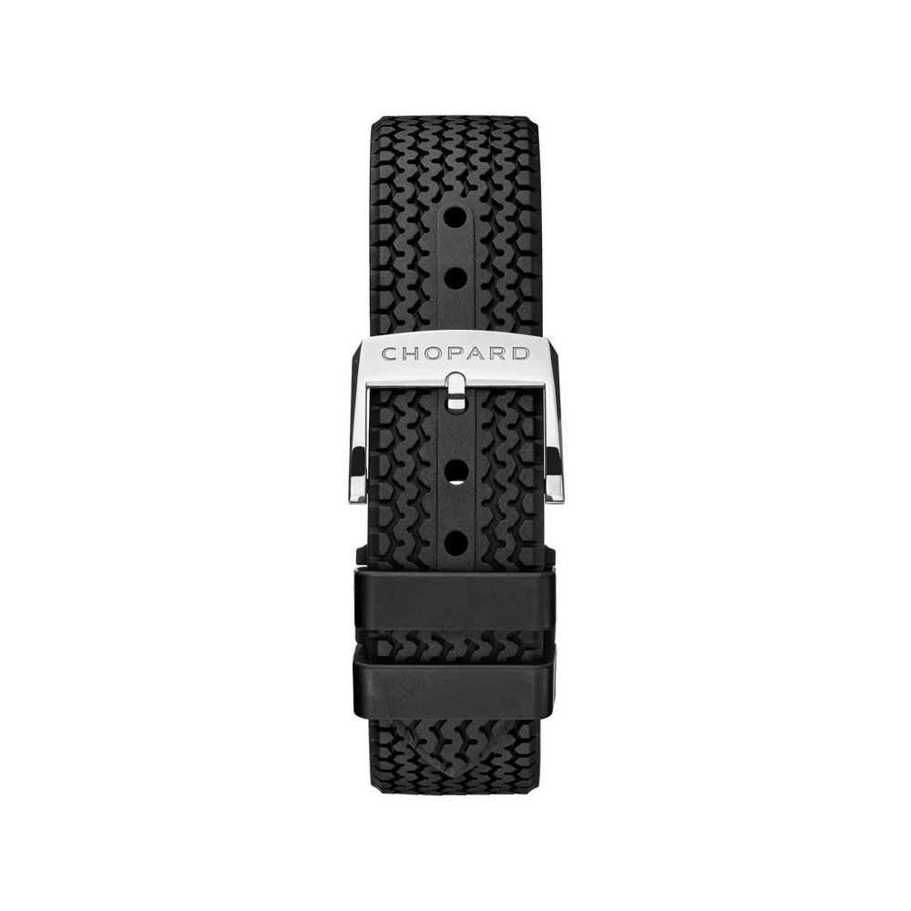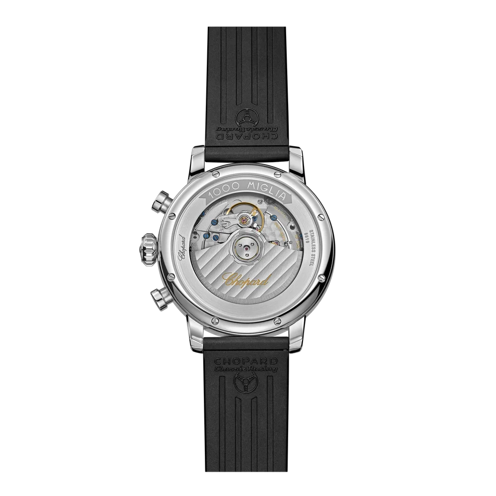 The Chopard Mille Miglia Classic Chronograph 168619-3001 has a 'Lucent' stainless steel case of 40.50mm, which houses the caliber 2894-2 - a self-winding movement with chronograph and date. The dial is Black with an engine-turned finish.