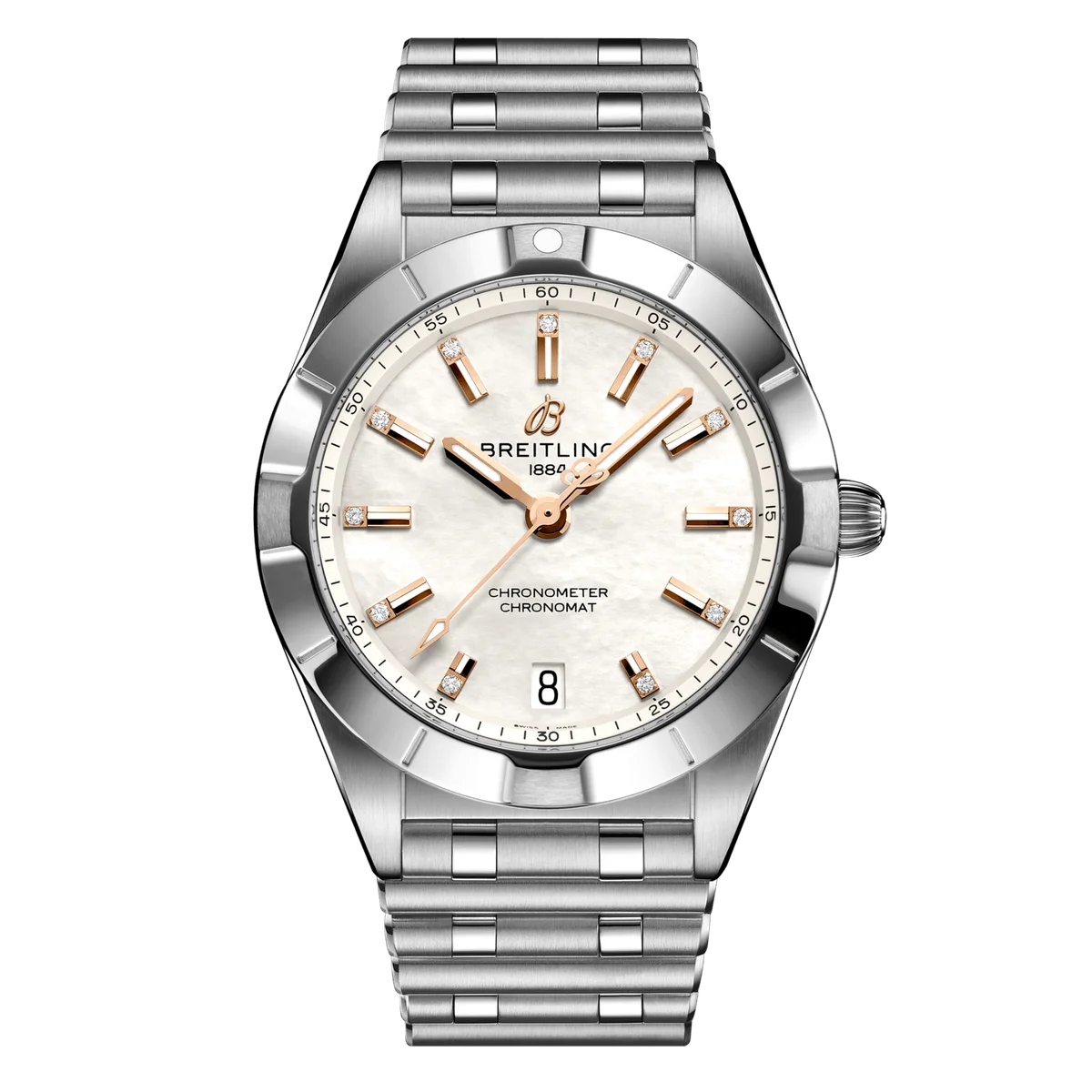 Breitling Chronomat 32 Ref. A77310101A4A1. Stylish yet elegant, the modern-retro inspired Chronomat 32 is the versatile sporty and chic watch for any occasion. It is available in an array of metal cases, from cool stainless steel, to goes-with-everything bicolor, or even luxurious 18k red gold. Women craving extra sparkle will also be able to opt for diamond-set bezels, indices, and colorful dials. Featuring Breitling’s iconic and comfortable “Rouleaux” bracelet with a butterfly clasp.