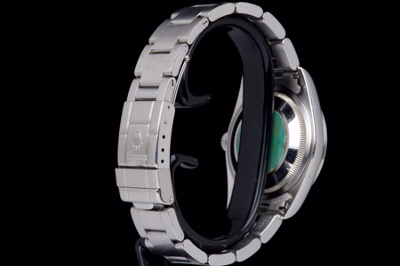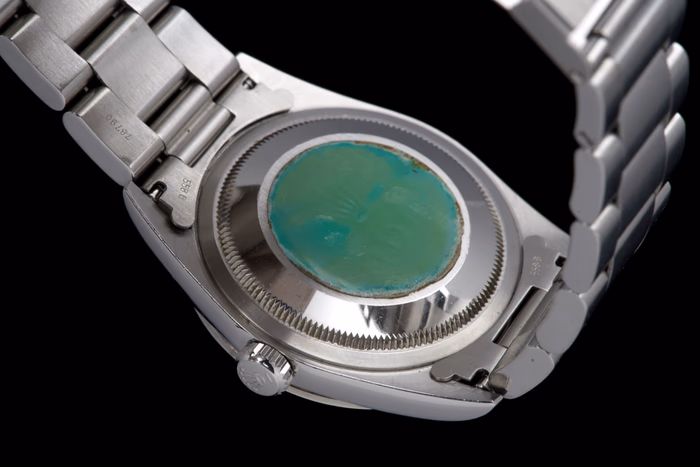 The watch is unpolished, still retaining the original green factory sticker on the caseback.