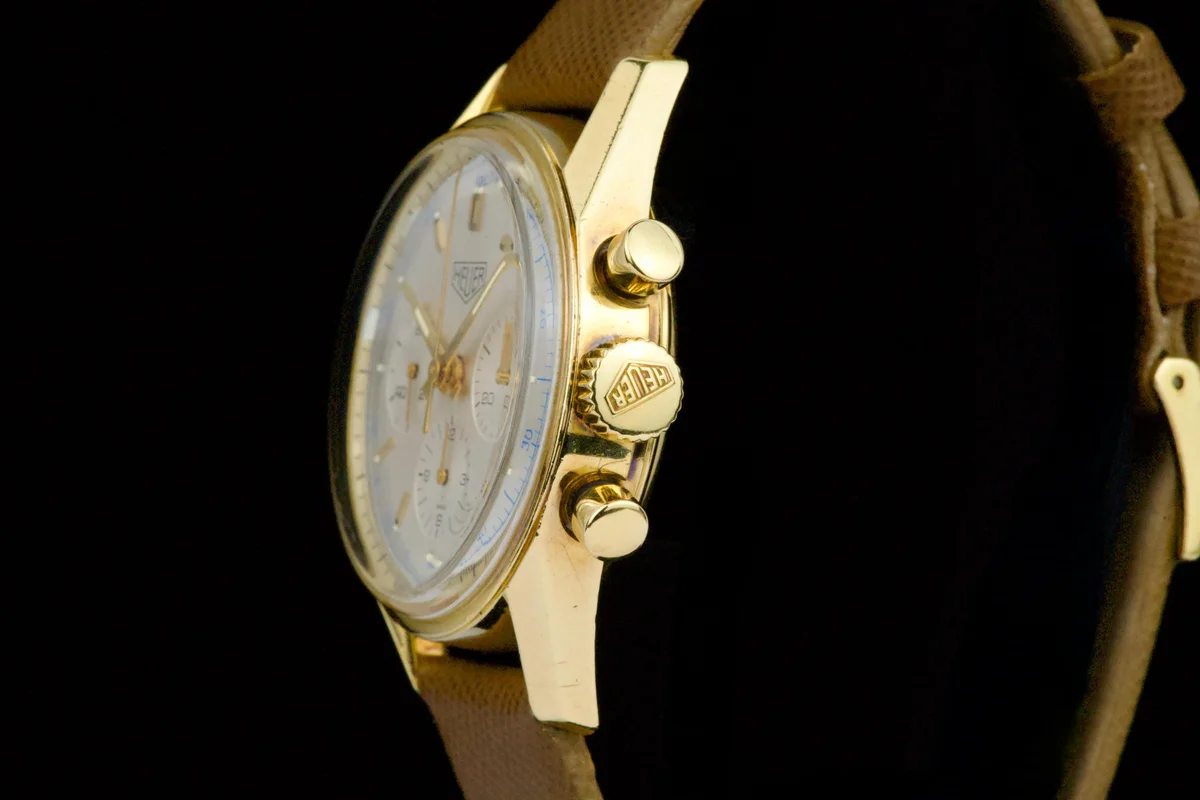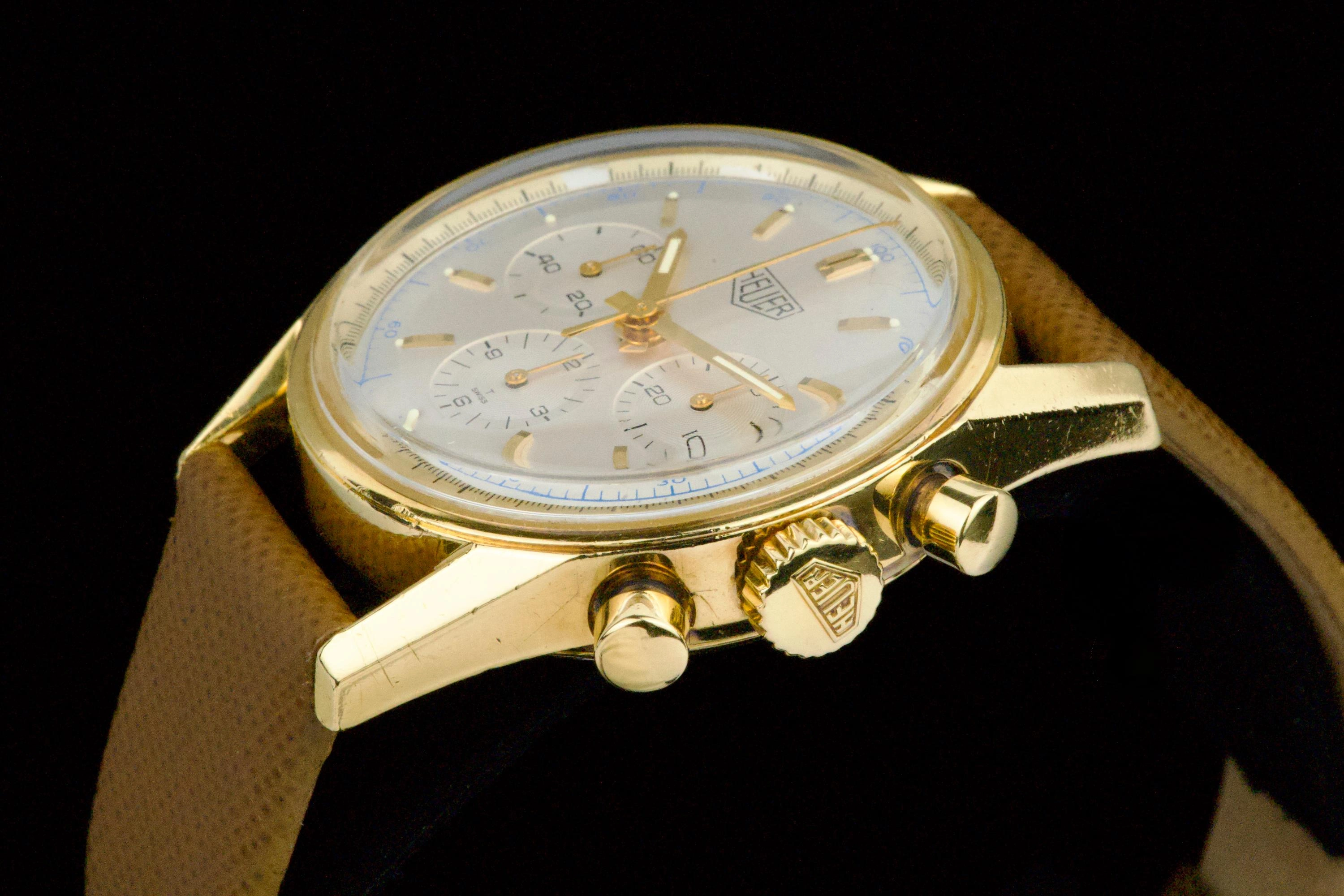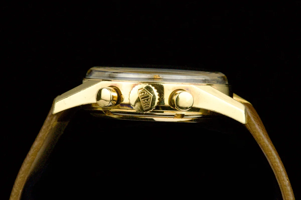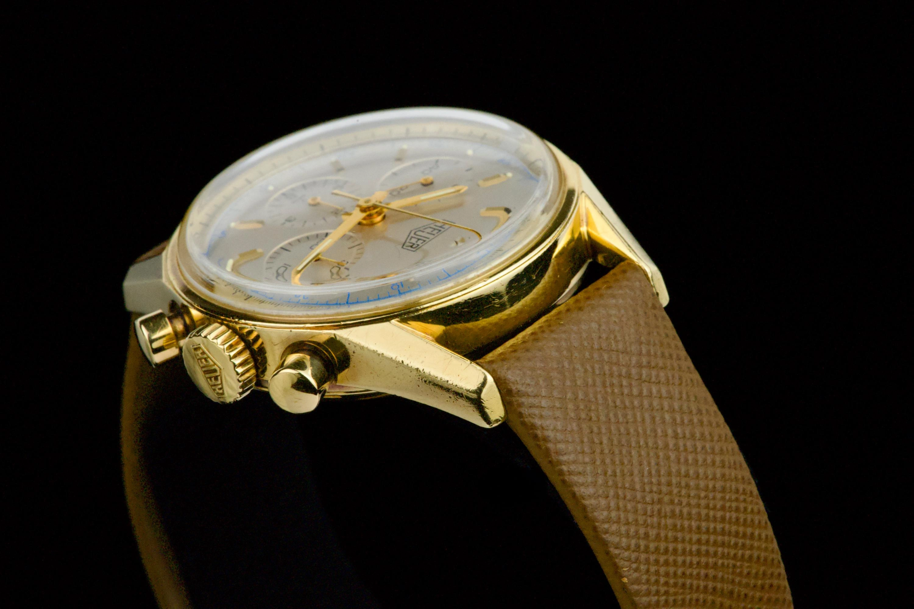 The TAG Heuer Carrera CS3140.BC0727 is part of the first series of re-editions of the Carrera model, which was in production from approx. 1996 up until 2002. This watch has a Yellow Gold case of 36.00mm, which houses the hand-wound Lemania 1873 chronograph movement. The dial is Silver.