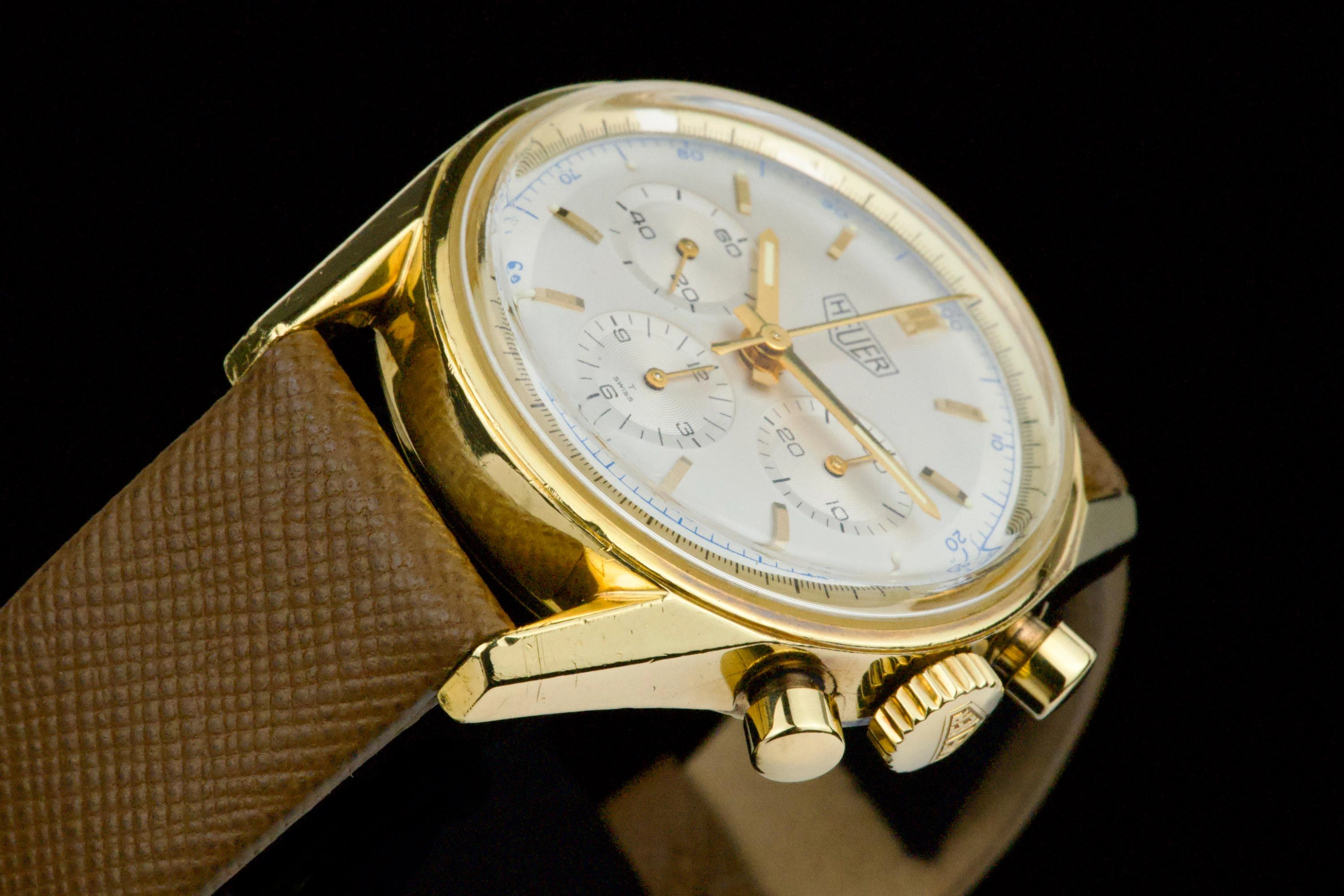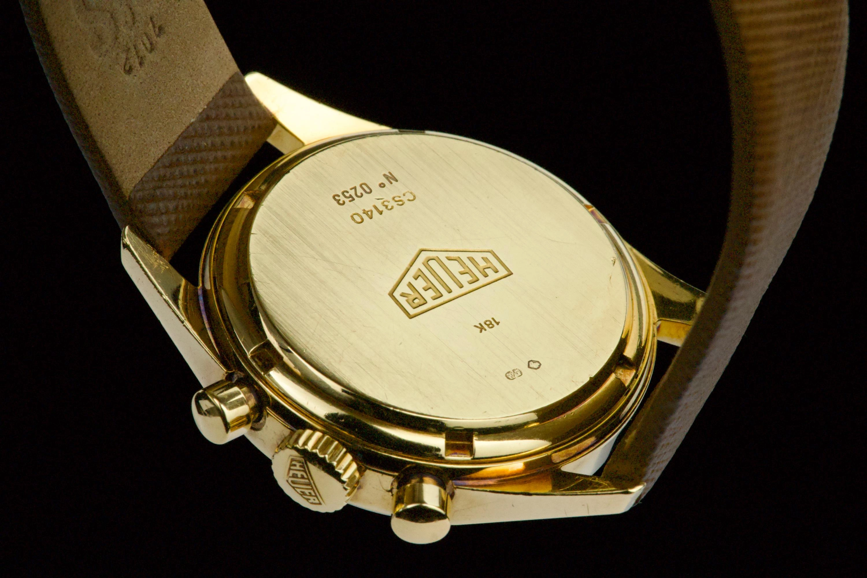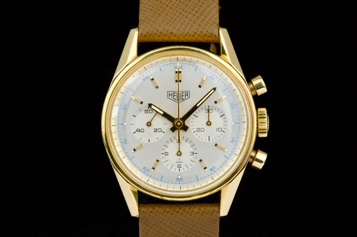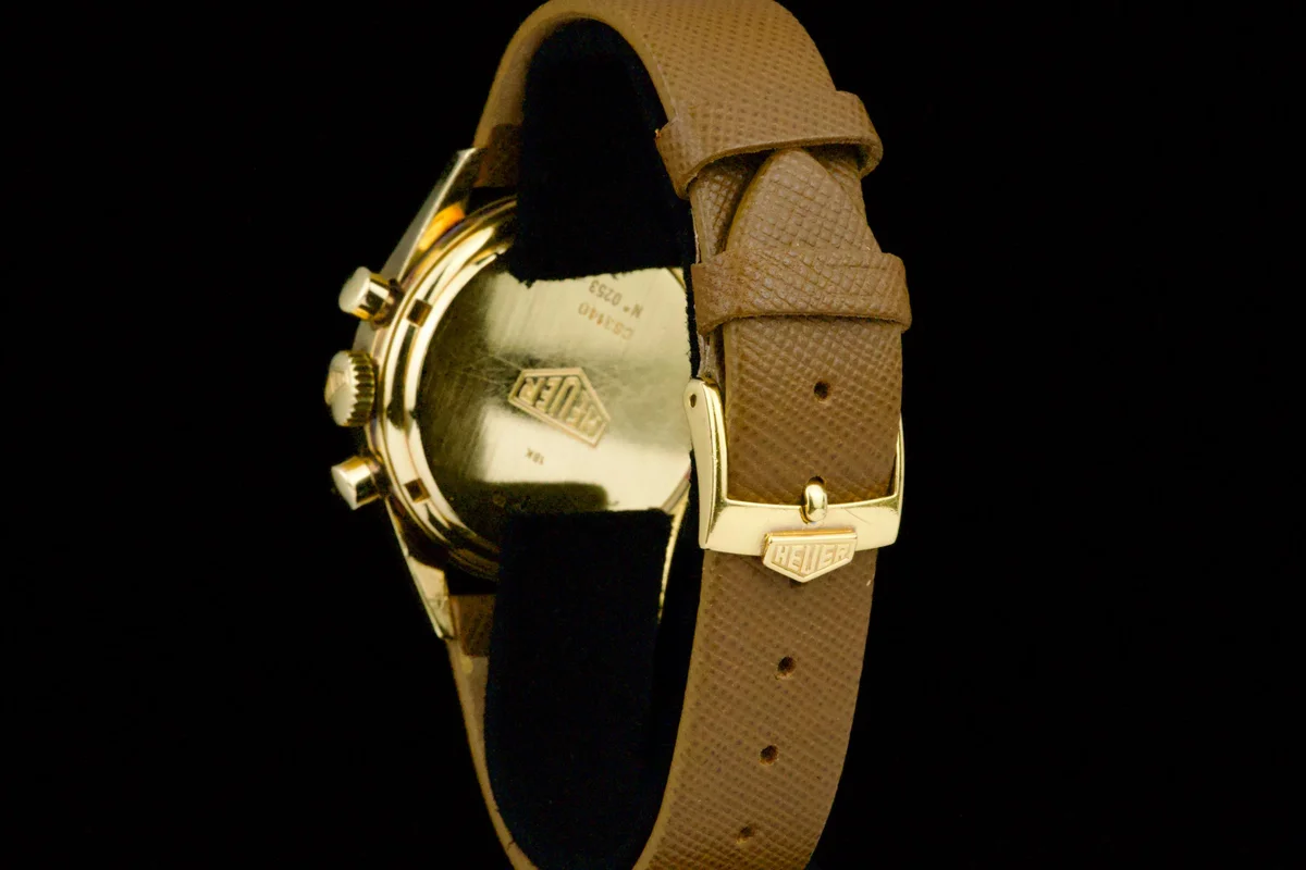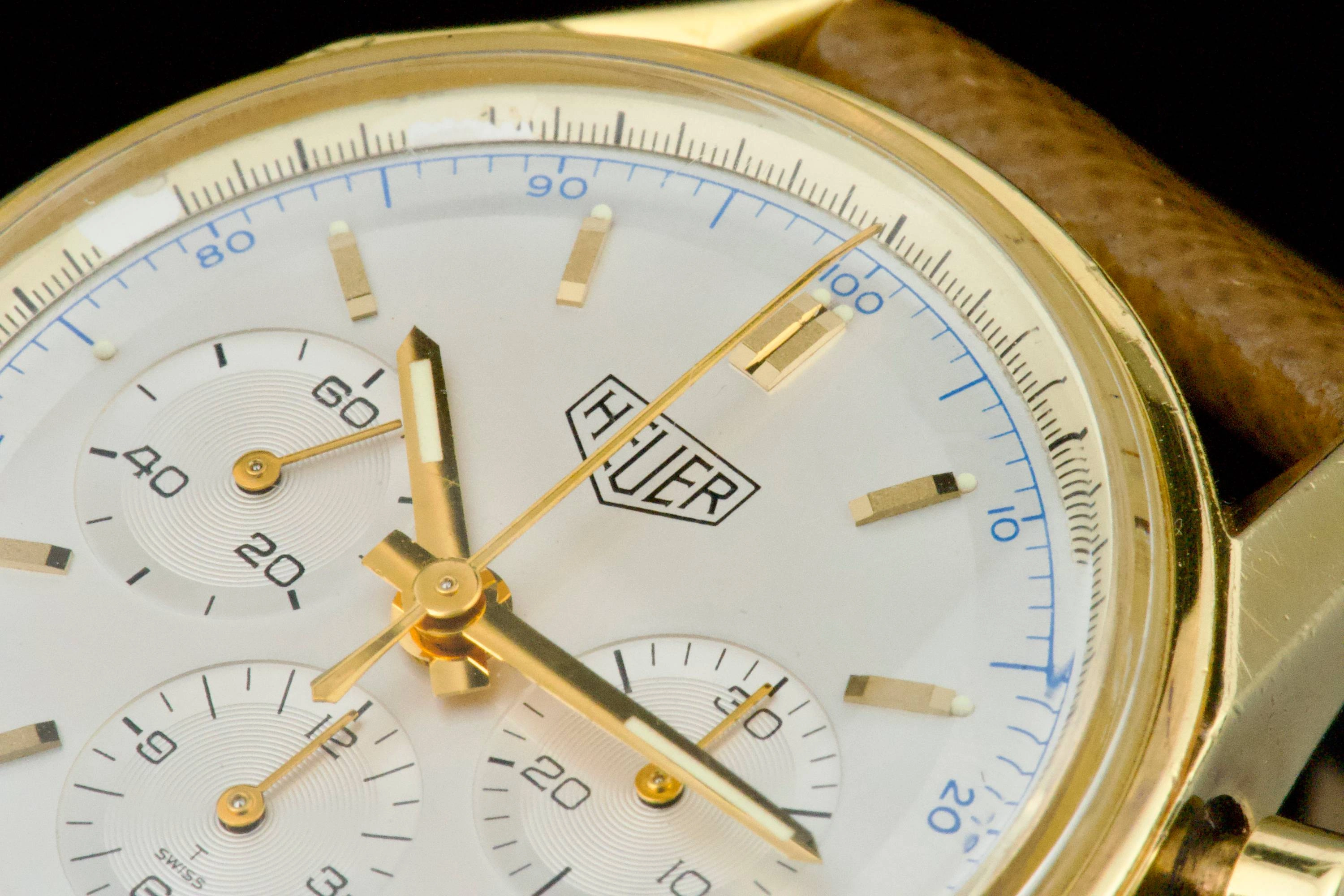 The TAG Heuer Carrera CS3140.BC0727 is part of the first series of re-editions of the Carrera model, which was in production from approx. 1996 up until 2002. This watch has a Yellow Gold case of 36.00mm, which houses the hand-wound Lemania 1873 chronograph movement. The dial is Silver.