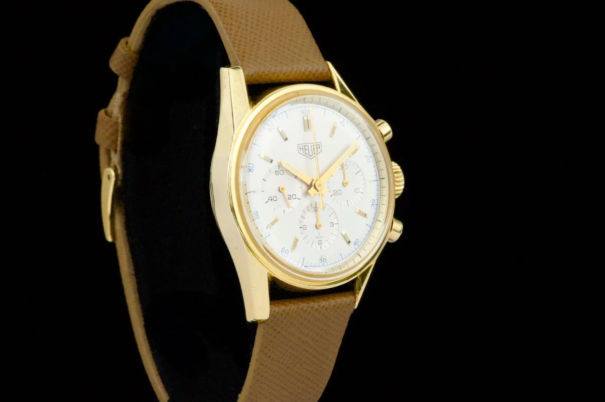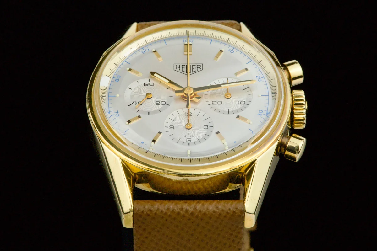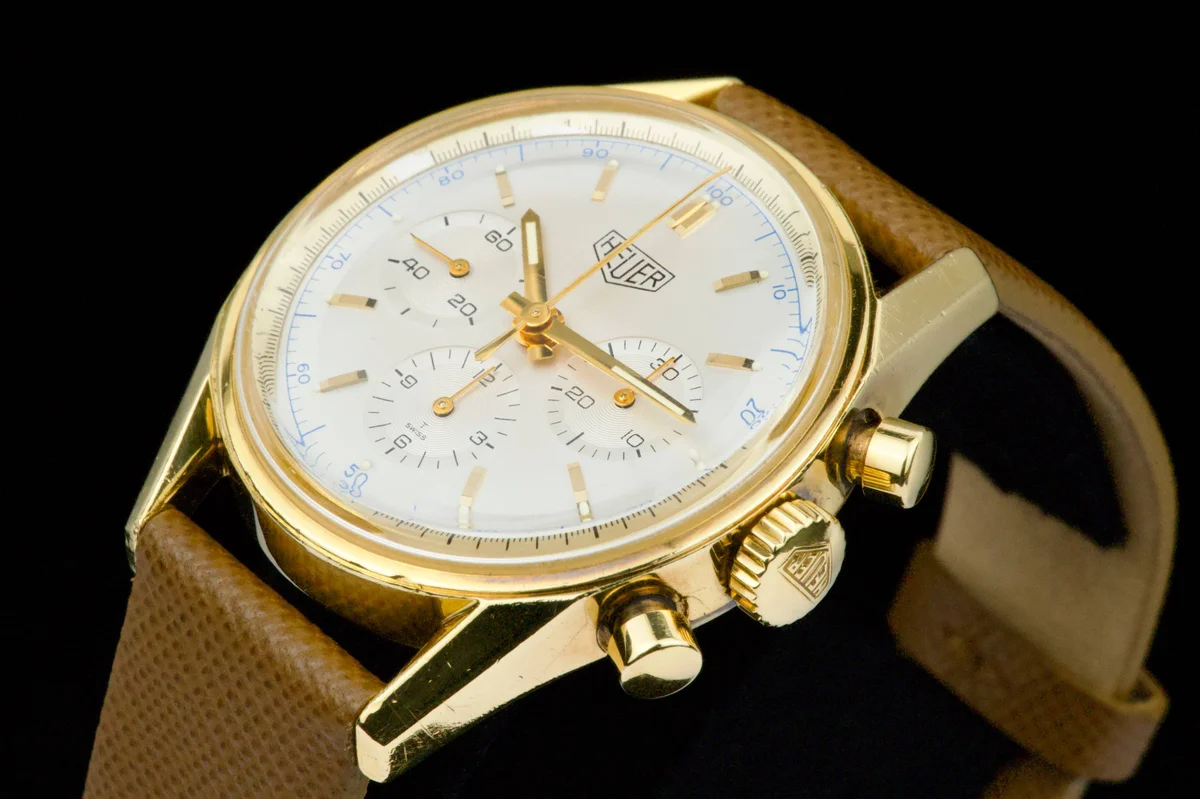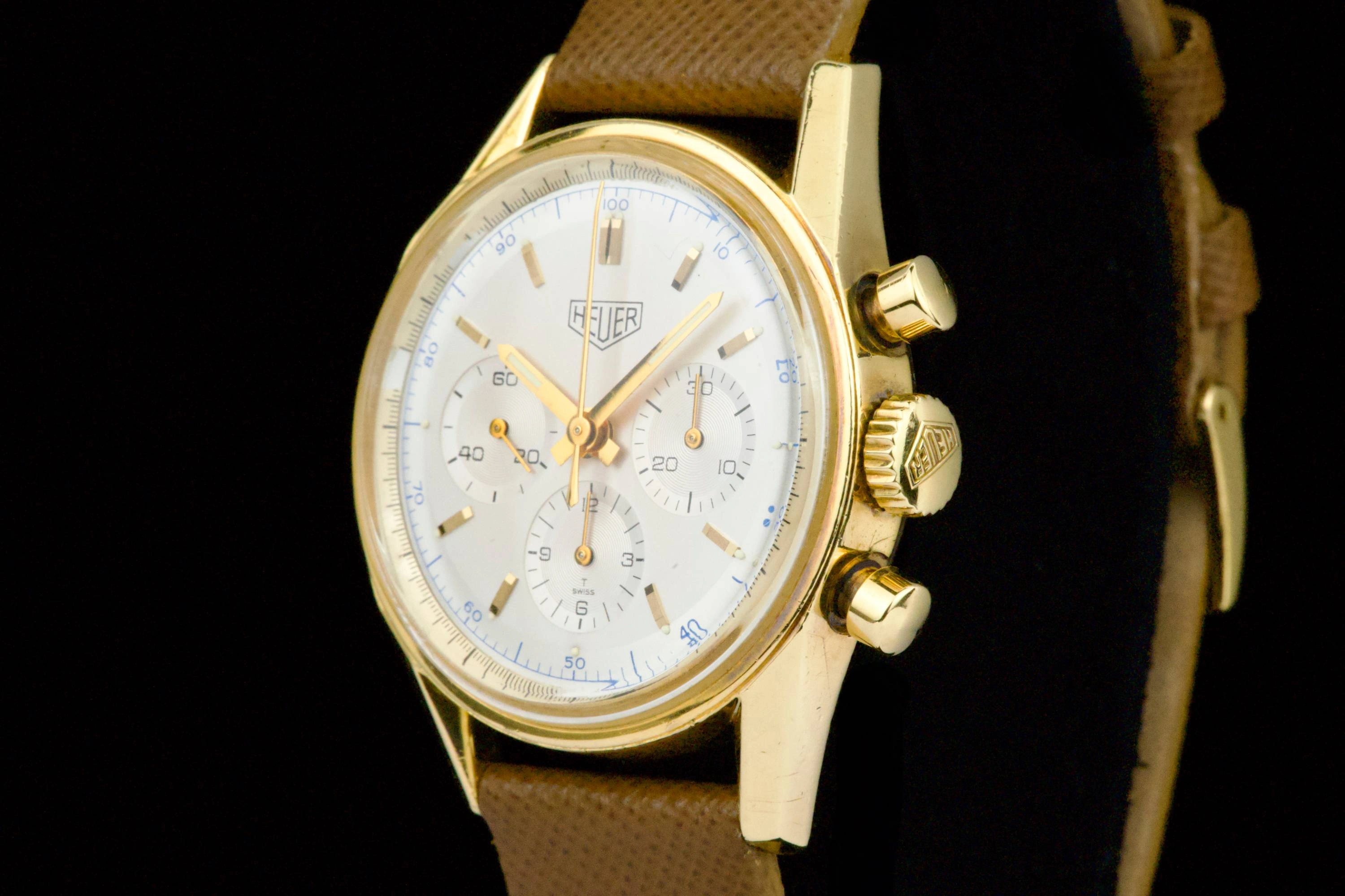 The TAG Heuer Carrera CS3140.BC0727 is part of the first series of re-editions of the Carrera model, which was in production from approx. 1996 up until 2002. This watch has a Yellow Gold case of 36.00mm, which houses the hand-wound Lemania 1873 chronograph movement. The dial is Silver.