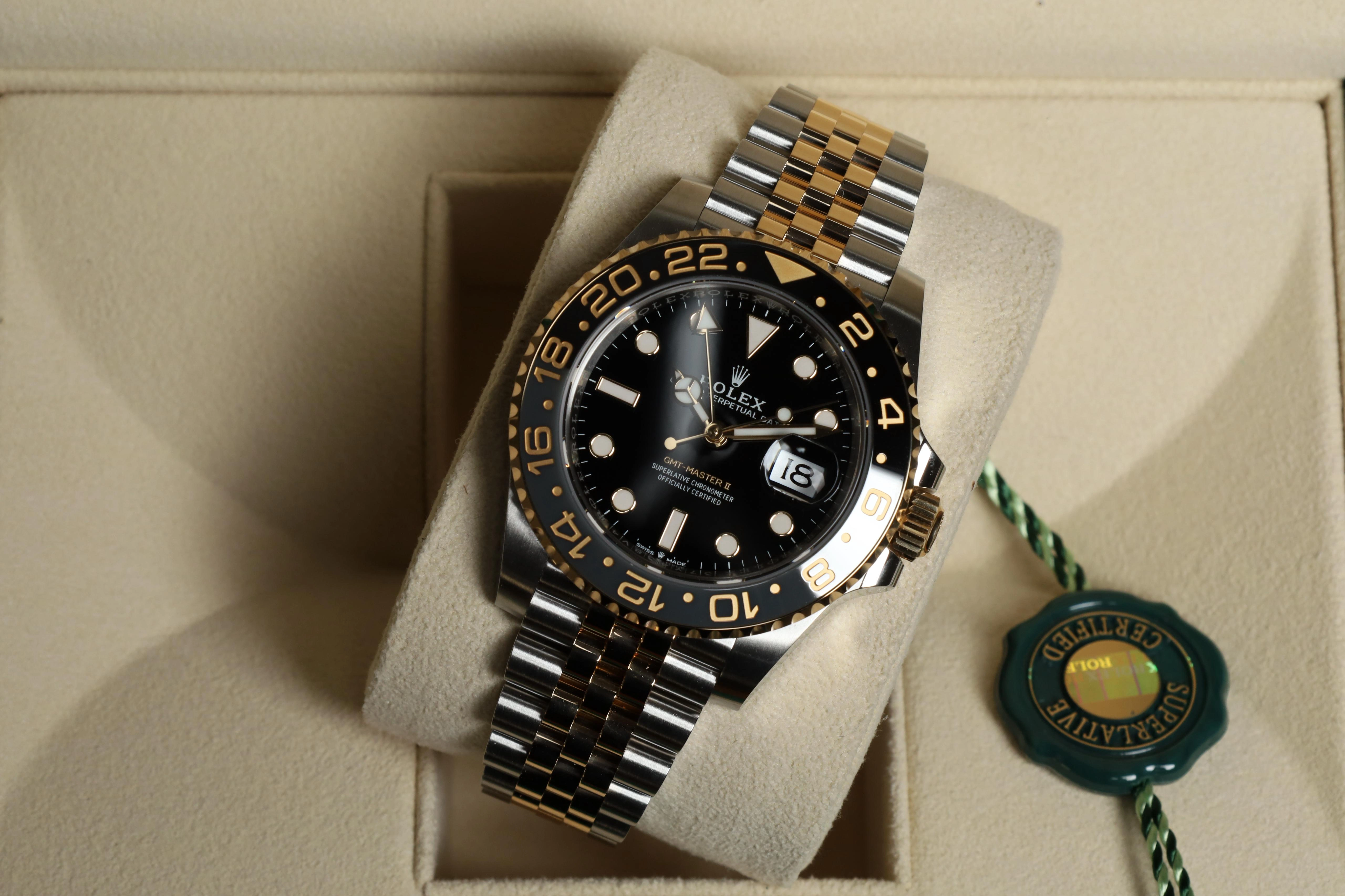 The Rolex GMT-Master II 126713GRNR-0001 of 2023 has case and bracelet done in a combination of stainless steel and yellow gold. The ceramic bezel insert is executed in grey and black ceramic. This model features a black dial and a two-colour Cerachrom bezel insert in grey and black ceramic. In addition to conventional hour, minute and seconds hands, the GMT-Master II features an arrow-tipped hand, which circles the dial once every 24 hours, as well as a bidirectional rotatable 24-hour graduated bezel.