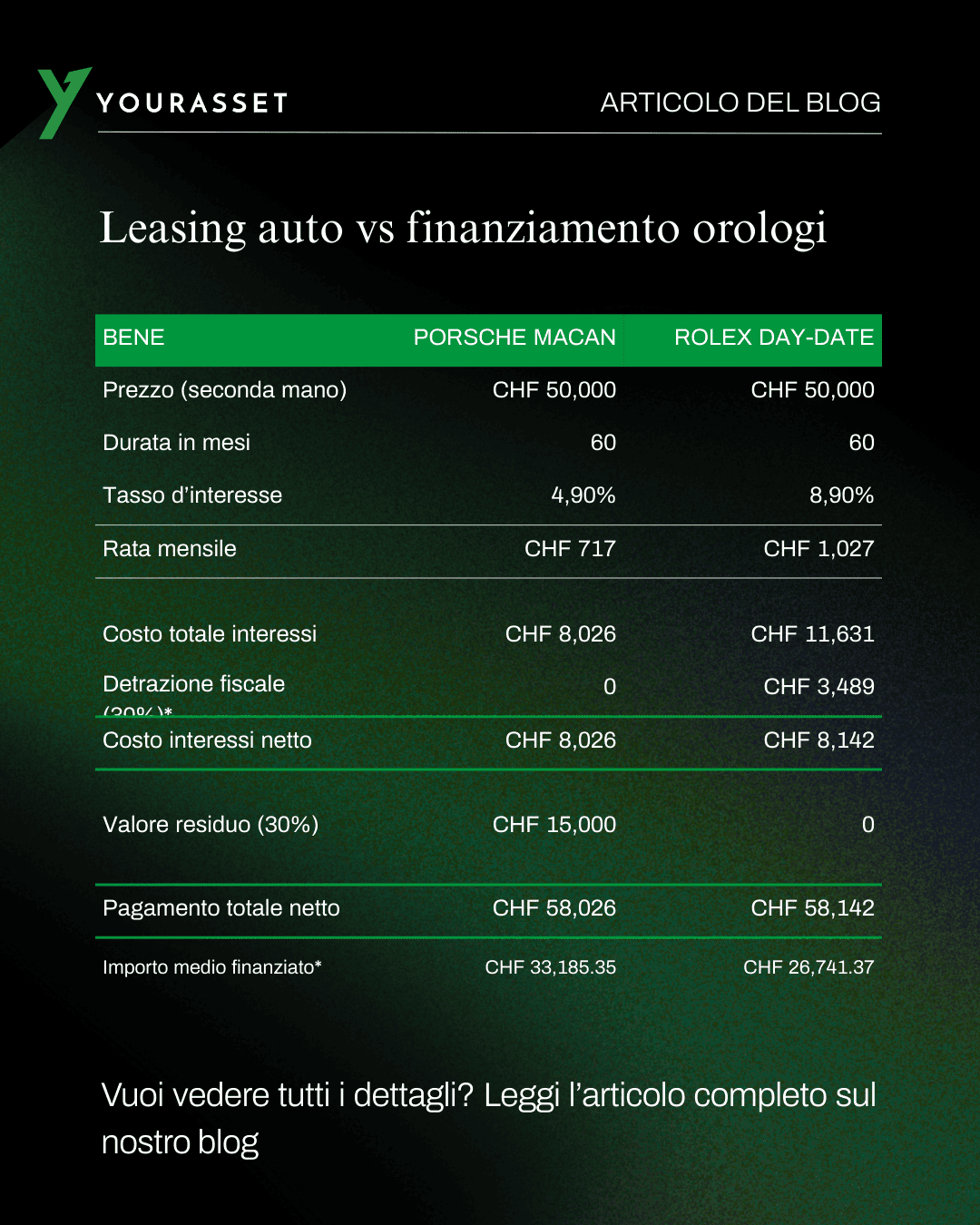 4,9% leasing di una Porsche Macan e 8,9% finanziamento di un Rolex Day-Date. Entrambi usati (pre-owned) e al prezzo di mercato.