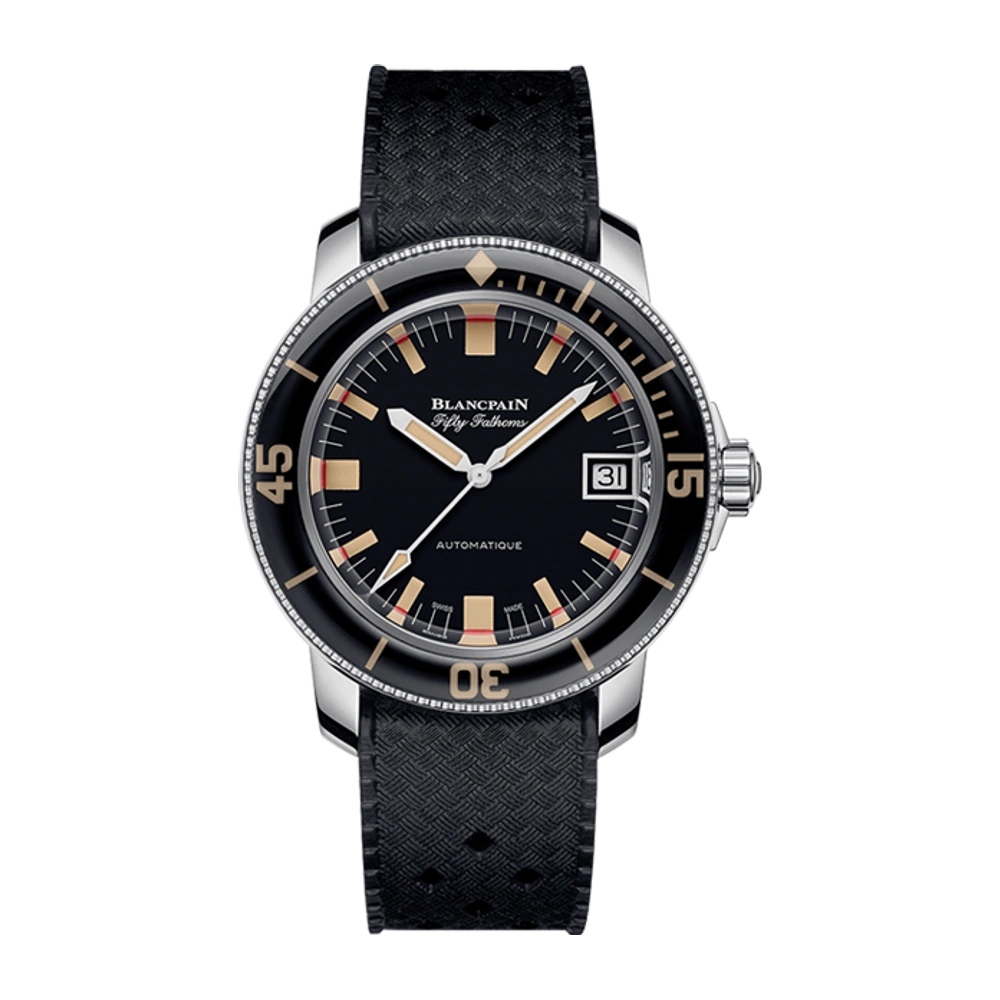 The Blancpain Fifty Fathoms Barakuda was introduced in 2019. Inspired by a model from Blancpain's past, it features a stainless steel case of 40.3mm and a black dial. This limited edition of 500 pieces comes on a 'Tropic' style strap.