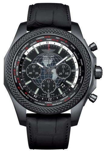 A limited edition of 500 pieces, the 2016 Breitling For Bentley B05 Unitime Midnight Carbon is an all-black version of the Bentley B05. It features a black-coated case, a matching 'Royal Ebony' dial and a crocodile & leather strap. The in-house B05 movement features a column-wheel chronograph and world-time indications.