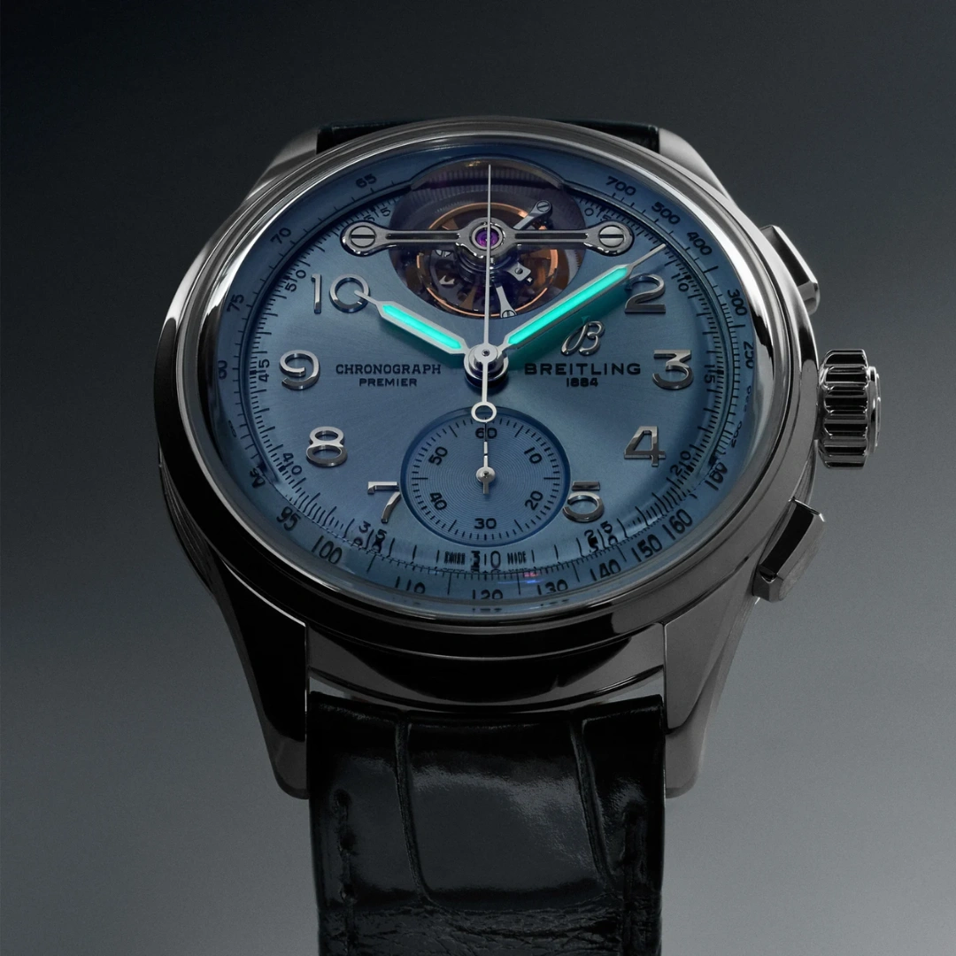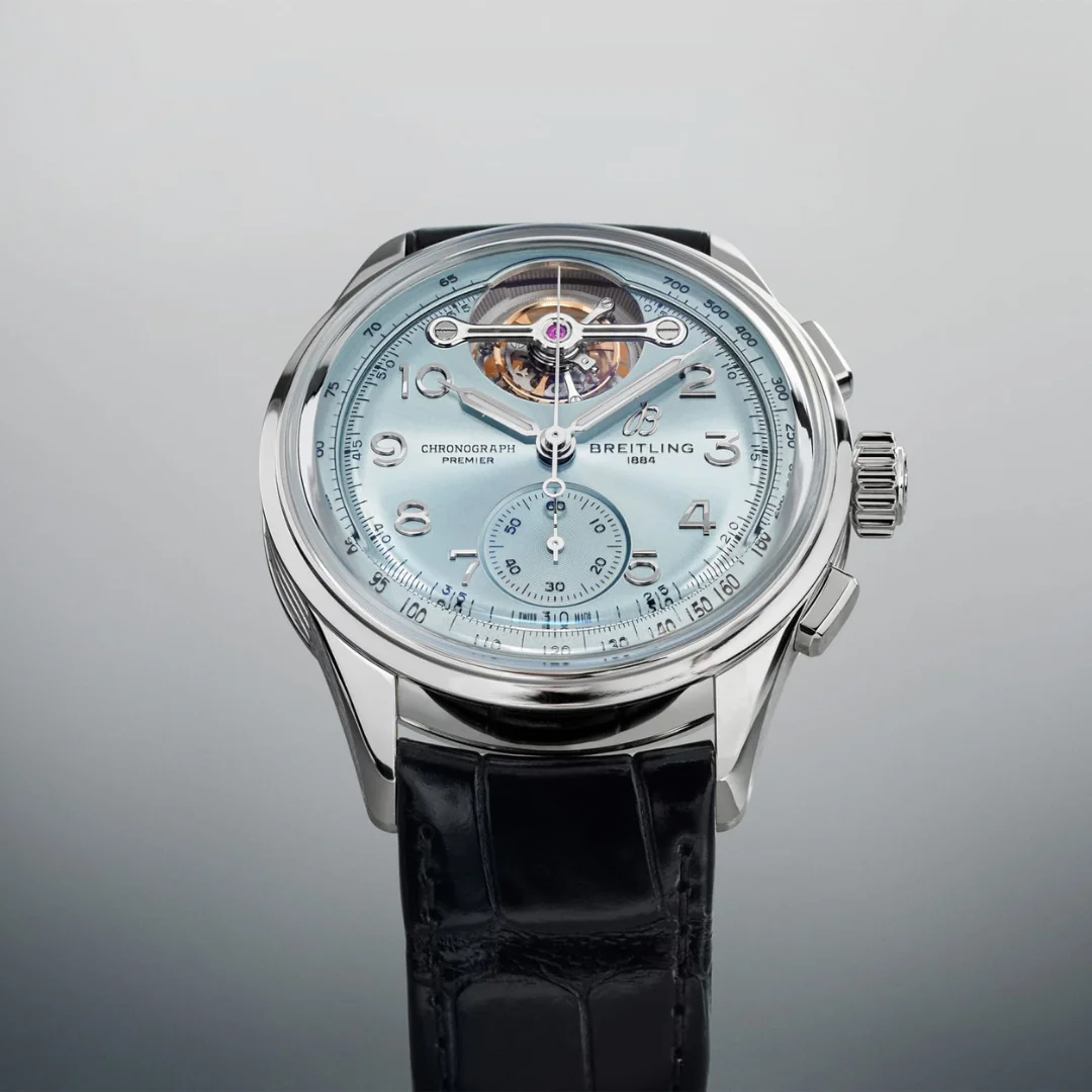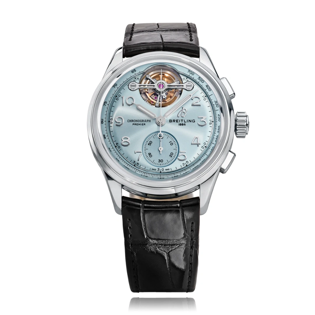 Introduced in 2024, the Breitling Premier Heritage B21 Chronograph Tourbillon reference LB21201A1C1P1 is a limited edition of 18 pieces created for Bucherer. The Platinum case of 42.00mm holds a self-winding movement with chronograph and tourbillon. The dial is ice Blue. Premier B21 Chronograph Tourbillon 42, 42 mm, Platin, Alligatorlederband, schwarz, mit Falt-Schliesse Zifferblatt: ice blue arabisch, Automat, Kaliber Breitling B21 (La Joux-Perret) Manufaktur, kleine Sekunden-Anzeige, Saphir-Glas, 10 Atm, Tourbillon