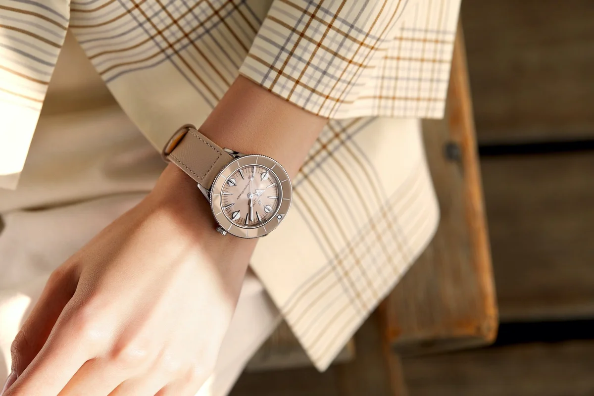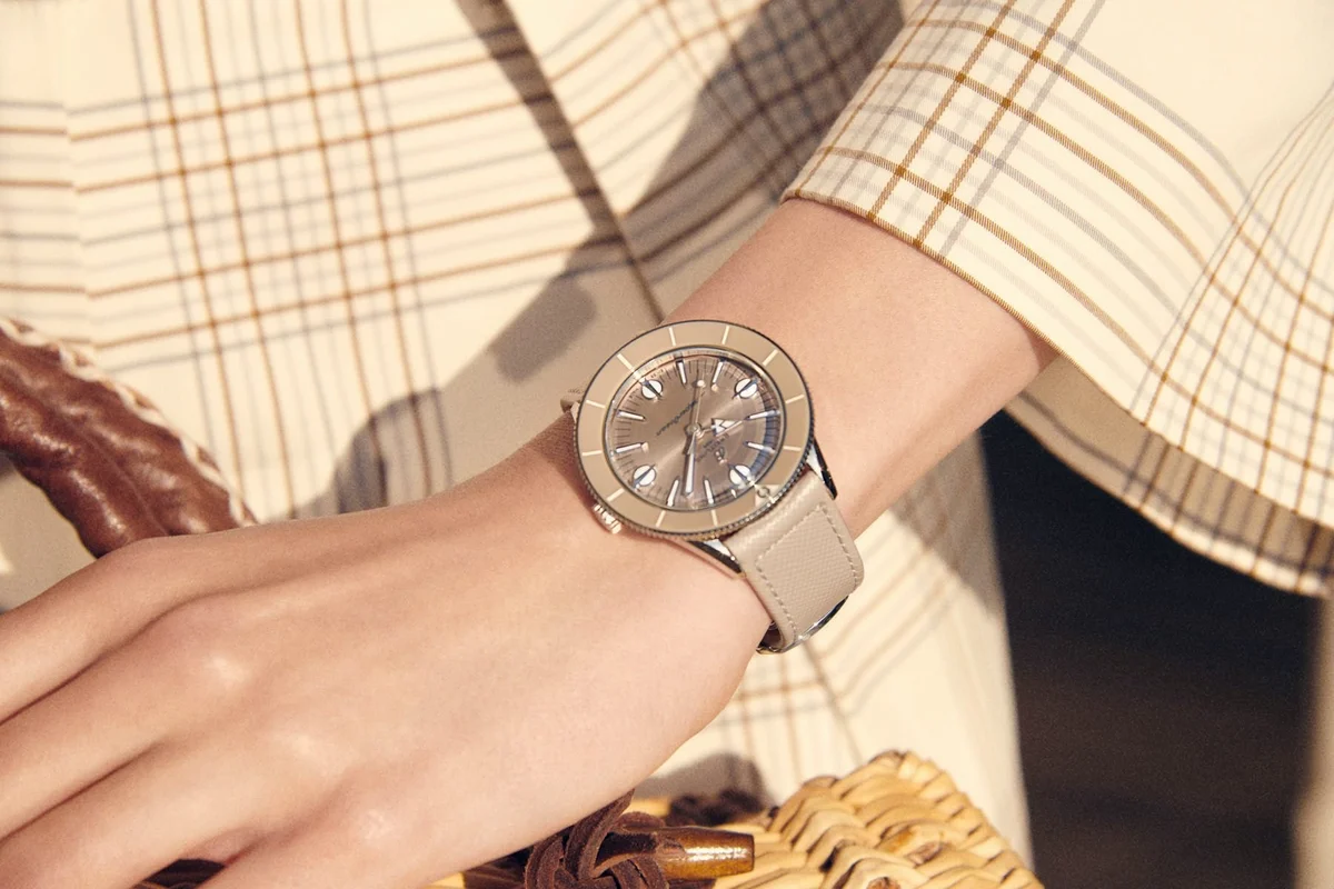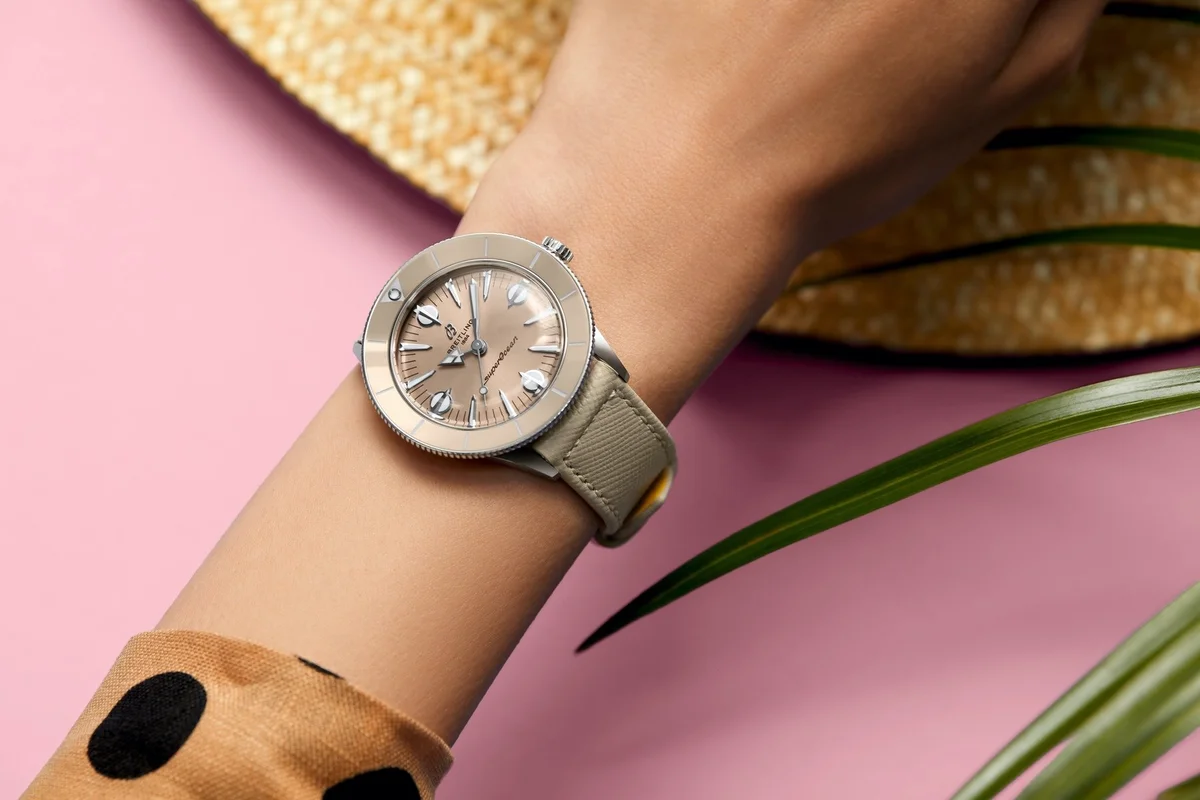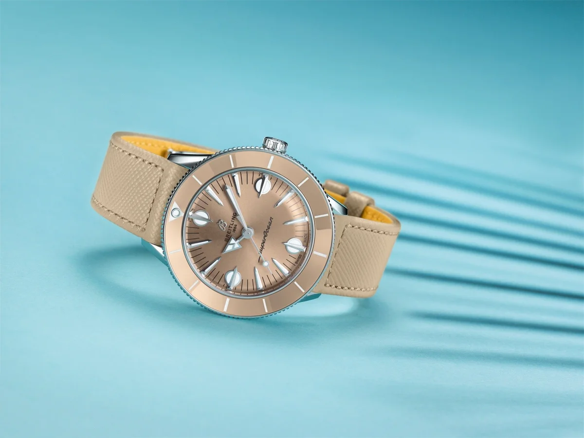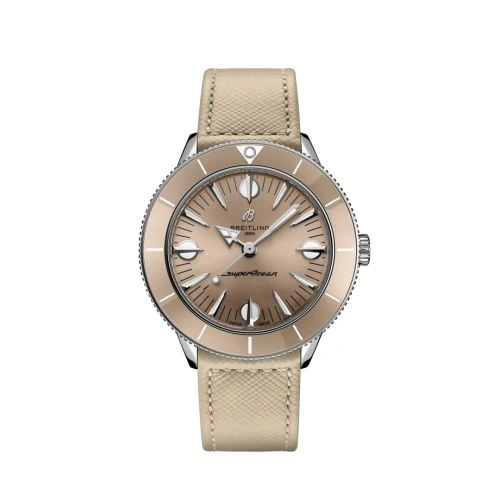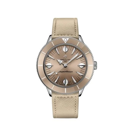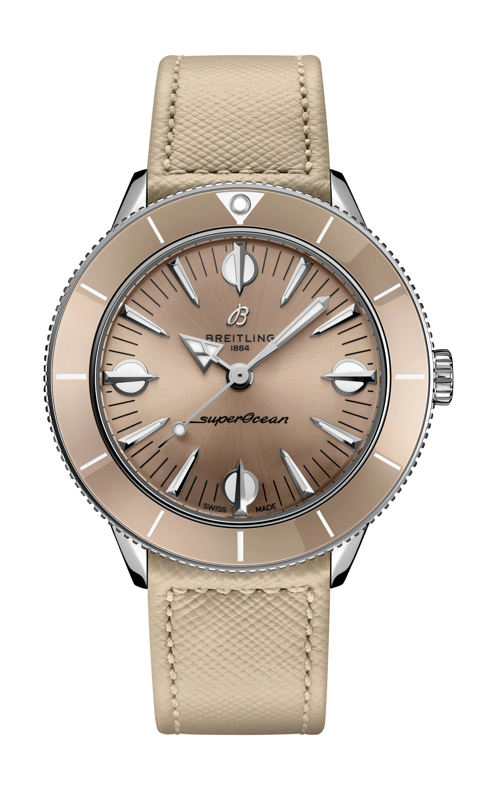 The Breitling Superocean Heritage '57 reference A10340A41A1X1 was introduced in 2021 as part of the 'Pastel Paradise' capsule collection. This Superocean Heritage '57 features a [CASE_DIAMETER] case and an 'Iced Latte' dial, bezel and strap.