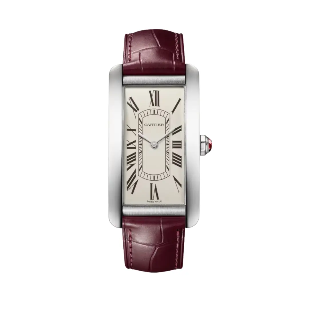 Cartier Tank Américaine Ref. WGTA0296, large model, mechanical movement with automatic winding. Case in 950 platinum. Strap in burgundy alligator leather, interchangeable folding clasp in 750 white gold. Case dimensions: 44.4 mm x 24.4 mm. Height: 8.6 mm. Water-resistant to 3 bar.
