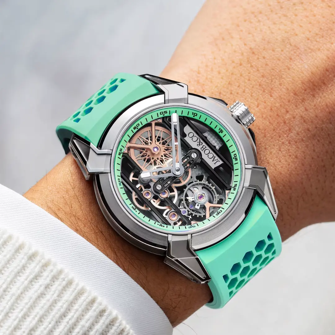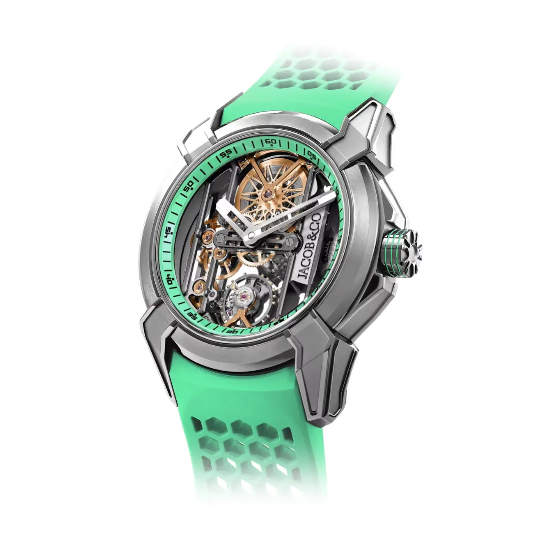 Jacob & Co Epic X Skeleton Ref. EX110.20.AP.AA.A, 44 mm, titanium, rubber strap, with pin buckle, skeleton dial manual winding, Cal. Jacob&Co JCAM02, sapphire-crystal, 10 atm, mint green