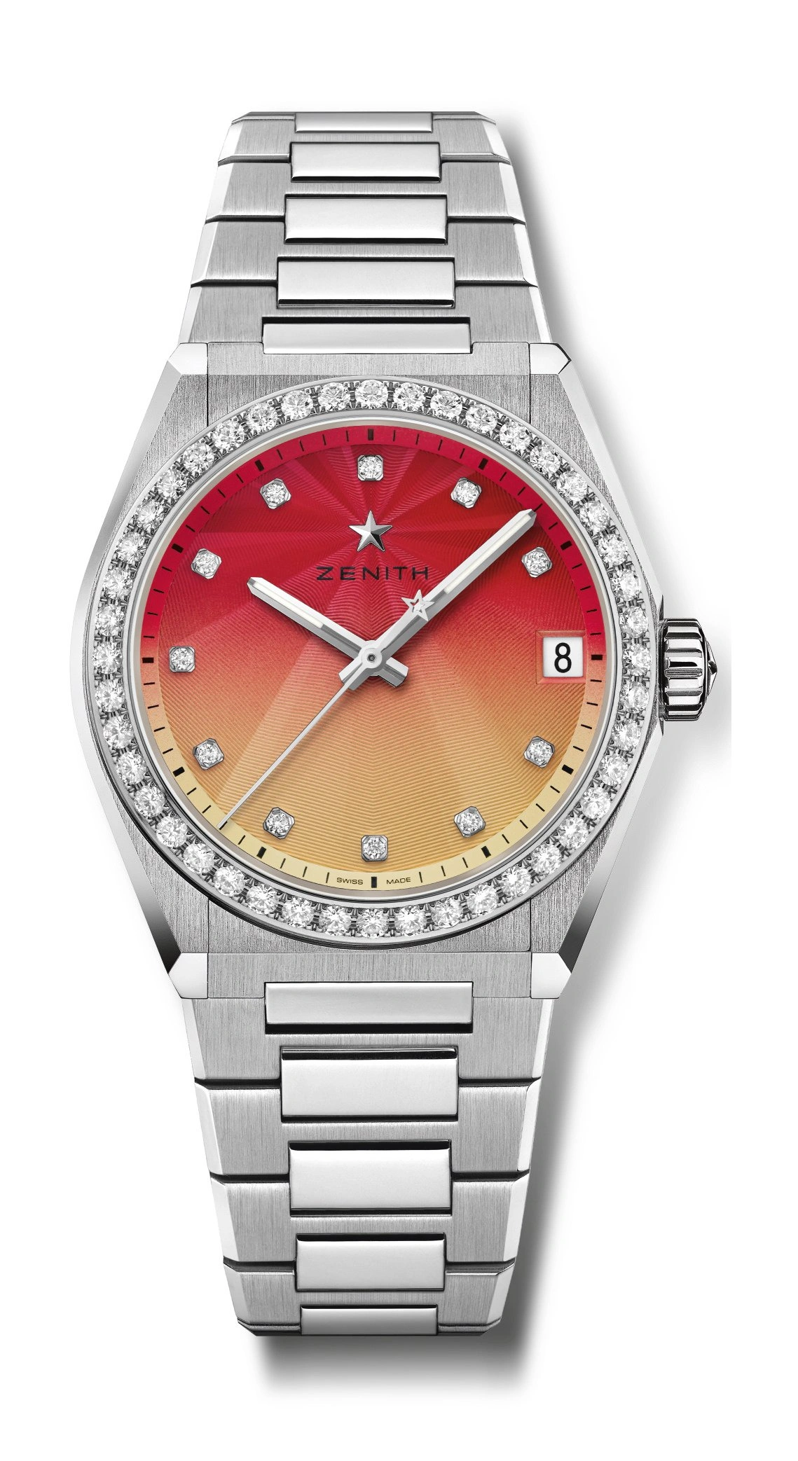 The DEFY Midnight Sunset is crafted in a 36mm steel case with a diamond-set bezel, featuring a guilloché engraved dial with a vertical colour gradient shifting from red to yellow. The DEFY Midnight women's watch comes with a steel bracelet with multiple straps than can easily be swapped without requiring any tools. Powered by the ELITE automatic manufacture calibre.