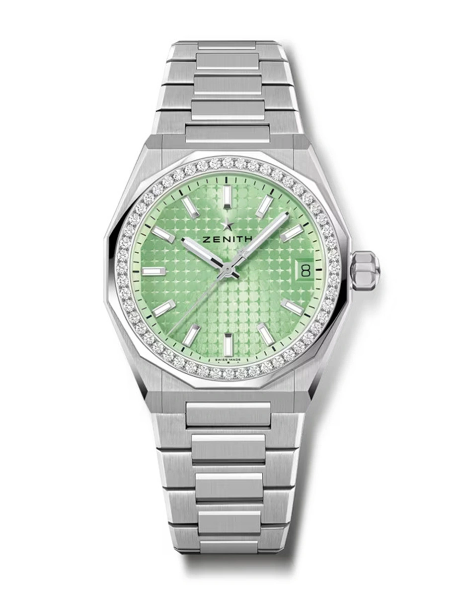 DEFY Skyline in a 36mm steel octagonal case with a diamond-set faceted bezel, featuring a metallic pastel green sunburst-patterned dial revisiting the emblematic ZENITH four-pointed star. Powered by the Elite 670 automatic manufacture movement. Interchangeable steel bracelet and green patterned rubber strap.