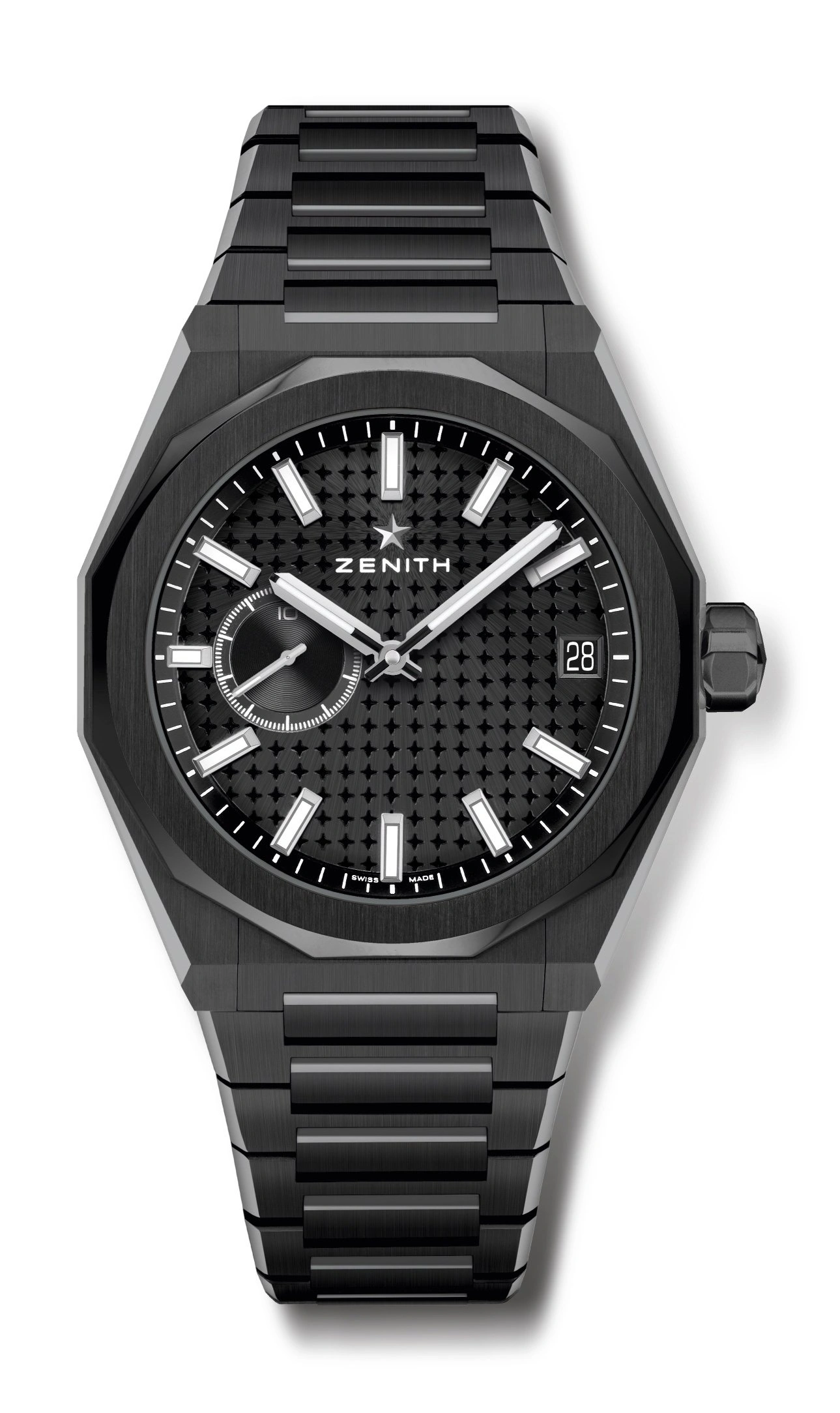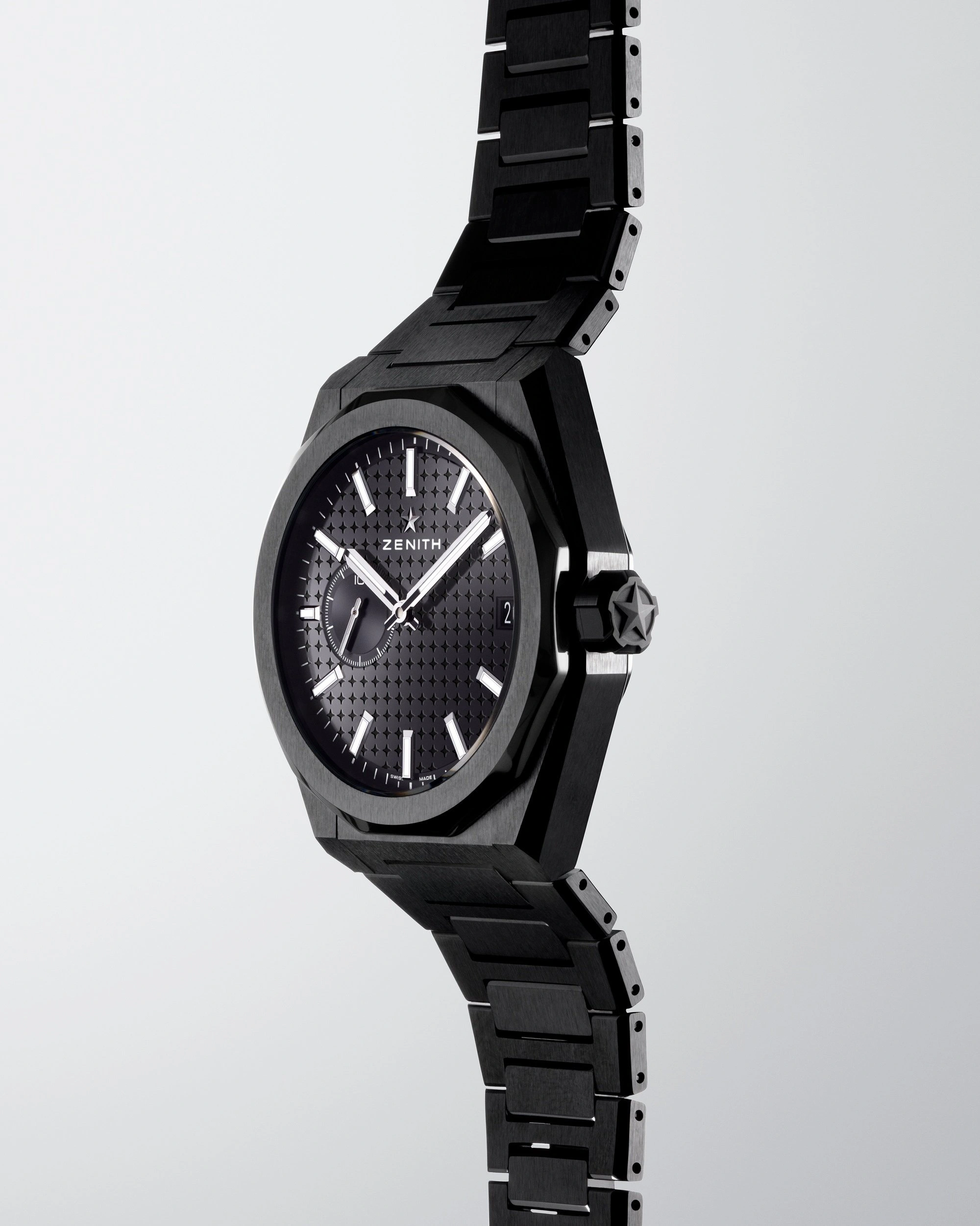 Die DEFY Skyline im achteckigen 41-mm-Gehäuse aus schwarzer Keramik mit facettierter Lünette und einem schwarzen Zifferblatt mit Sonnenschliff, das den emblematischen vierzackigen Stern von ZENITH aufgreift. Angetrieben von dem automatischen Hochfrequenzmanufakturwerk El Primero 3620 mit der ersten 1/10-Sekunden-Anzeige. Austauschbares Armband aus Keramik mit schwarz gemustertem Kautschukarmband.