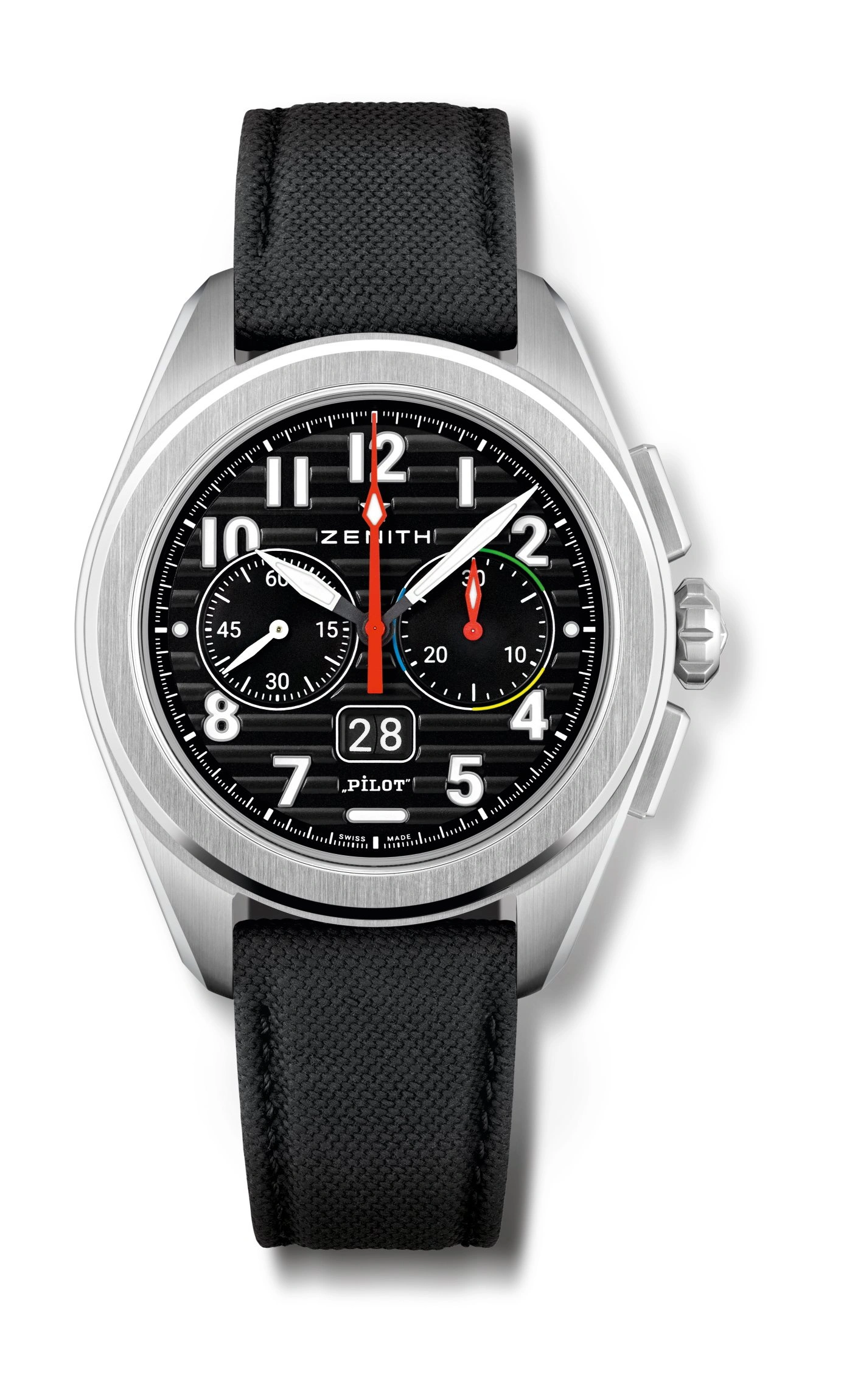 The ZENITH aviator's chronograph returns in the PILOT Big Date Flyback. Crafted in a 42.5mm steel case with an oversized crown, paired with a black corrugated dial featuring large luminescent Arabic numerals and coloured indications for easier reading. Delivered with interchangeable black cordura-effect rubber and brown calfskin leather straps. Powered by the El Primero 3652 automatic high-frequency chronograph calibre with big date and the flyback functions.