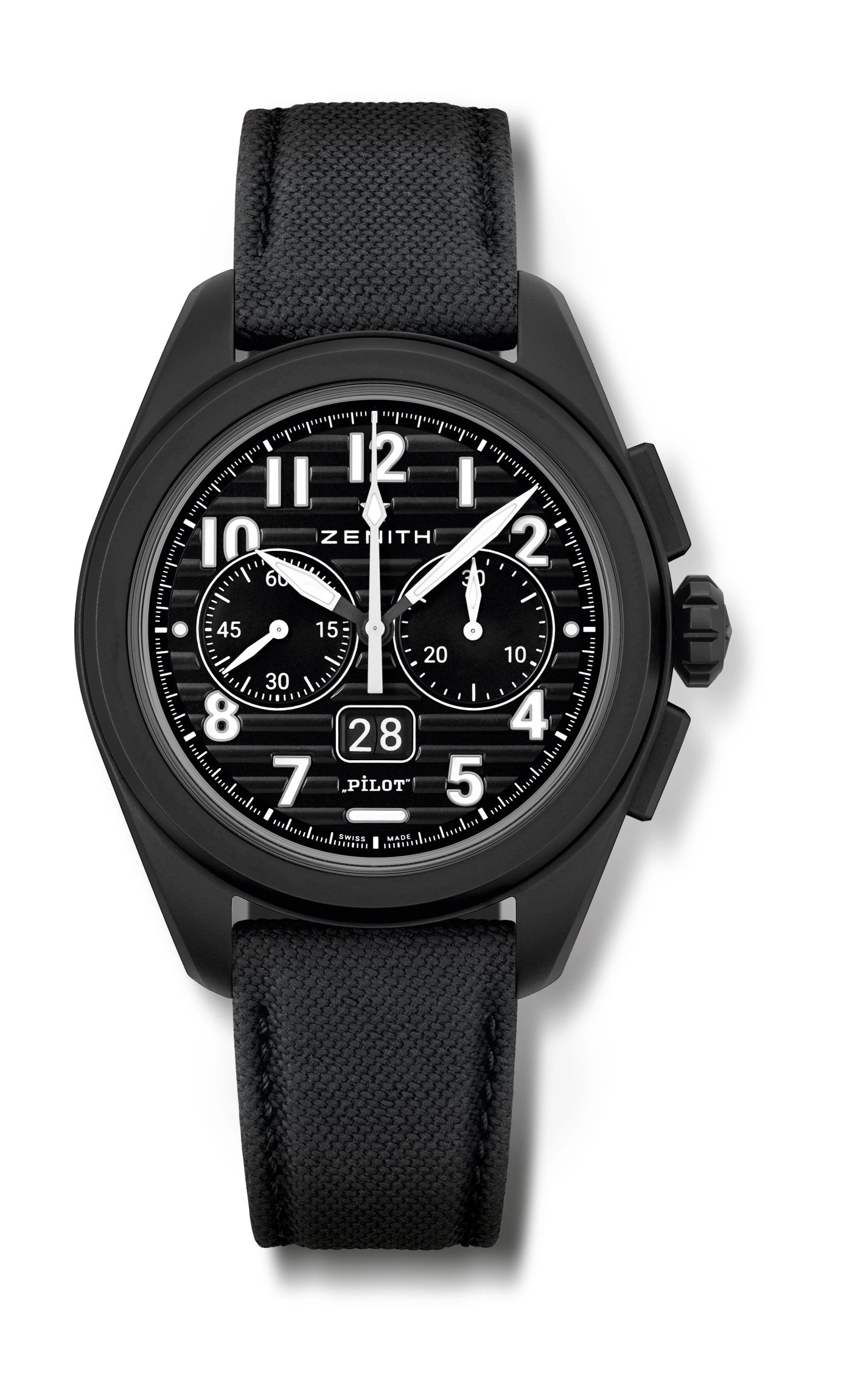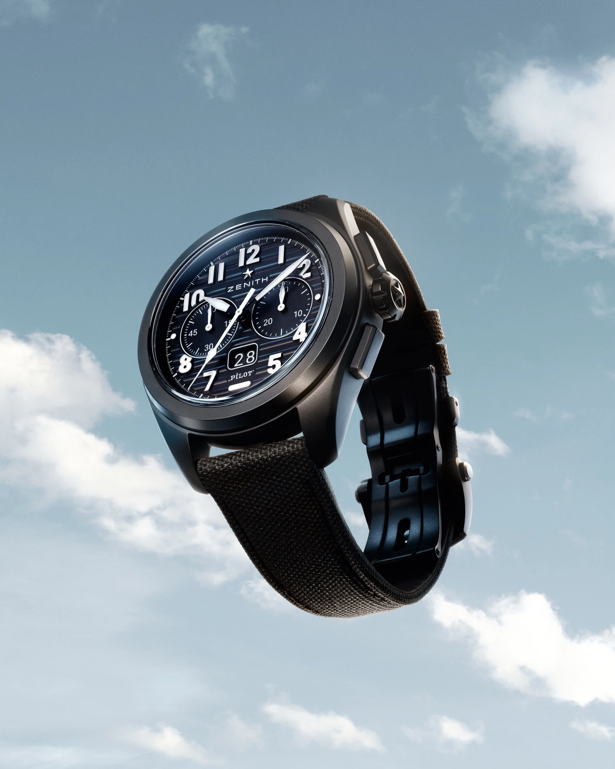 The ZENITH aviator's chronograph returns in the PILOT Big Date Flyback. Crafted in a 42.5mm black ceramic case with an oversized crown, paired with a black corrugated dial featuring large luminescent Arabic numerals. Delivered with interchangeable black and khaki cordura-effect rubber straps. Powered by the El Primero 3652 automatic high-frequency chronograph calibre with big date and the flyback functions.