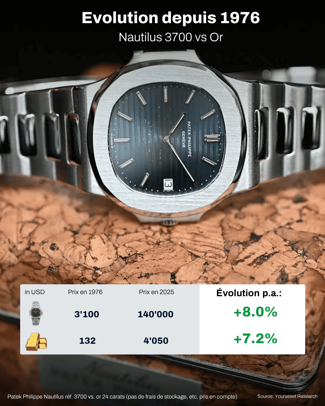 Le marché secondaire des montres de luxe s'est considérablement apprécié au fil des ans, et la Patek Philippe Nautilus en acier en est un exemple remarquable. Le prix d'une Patek Philippe Nautilus réf. 3700 a augmenté de plus de 4500% entre 1976 et aujourd'hui, tandis que l'or a augmenté de près de 3100%.
